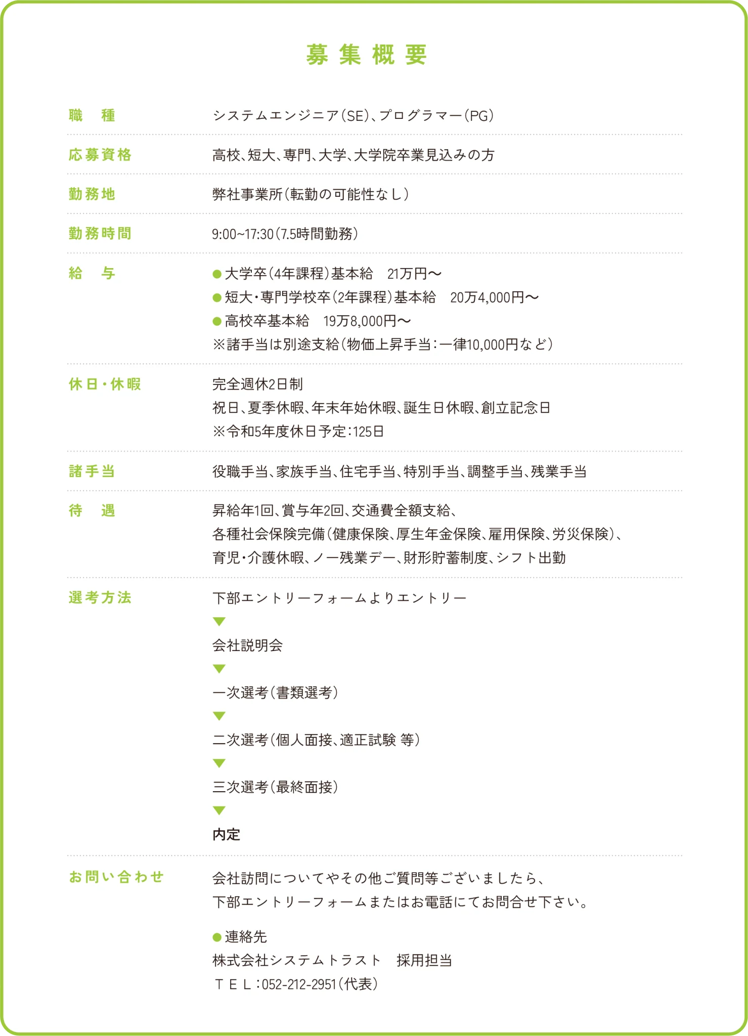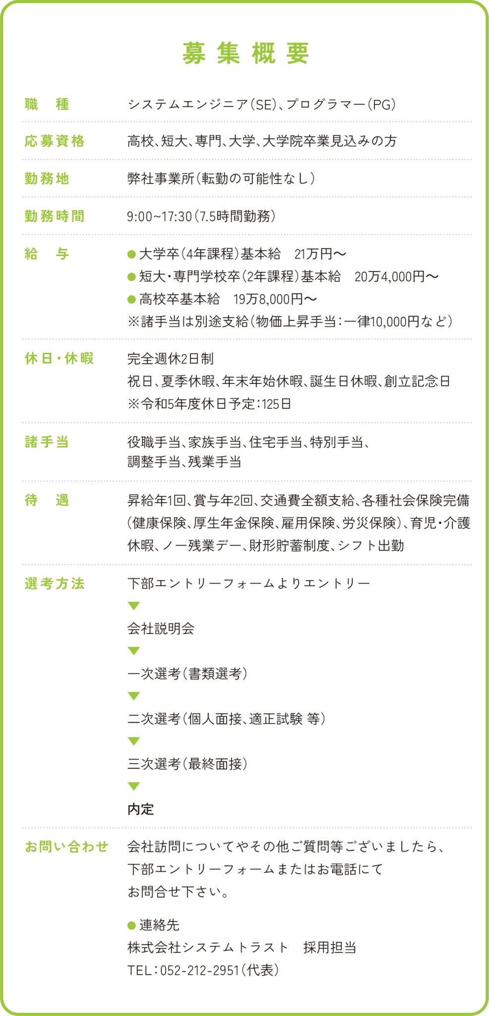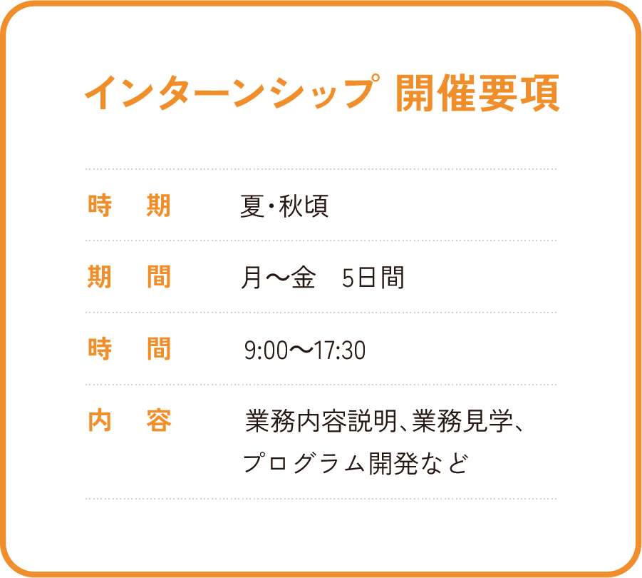 システムトラストでは、会社説明会とインターンシップを実施しています。日本や海外の専門学校、大学・大学院に在学中の学生を対象に、学年を問わず募集。会社説明会やインターンシップを通して、IT業界を肌で感じてみませんか?今後の情報については決定次第お知らせします。